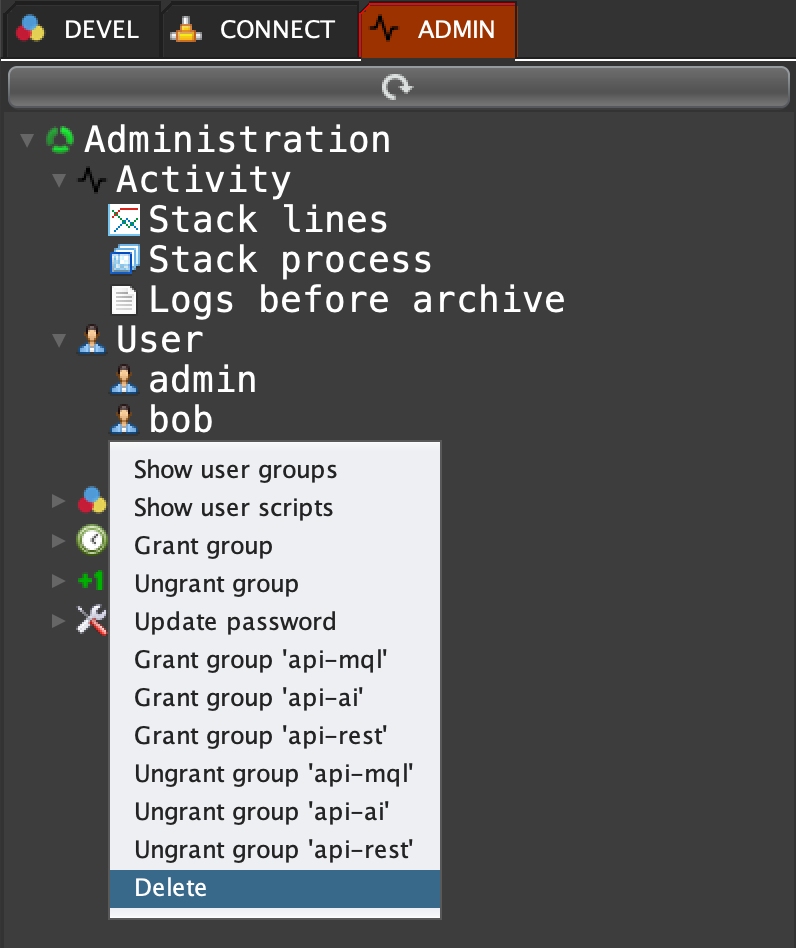 Click on the ADMIN tab, open 'User', right click on 'bob' and select 'Delete' ...
