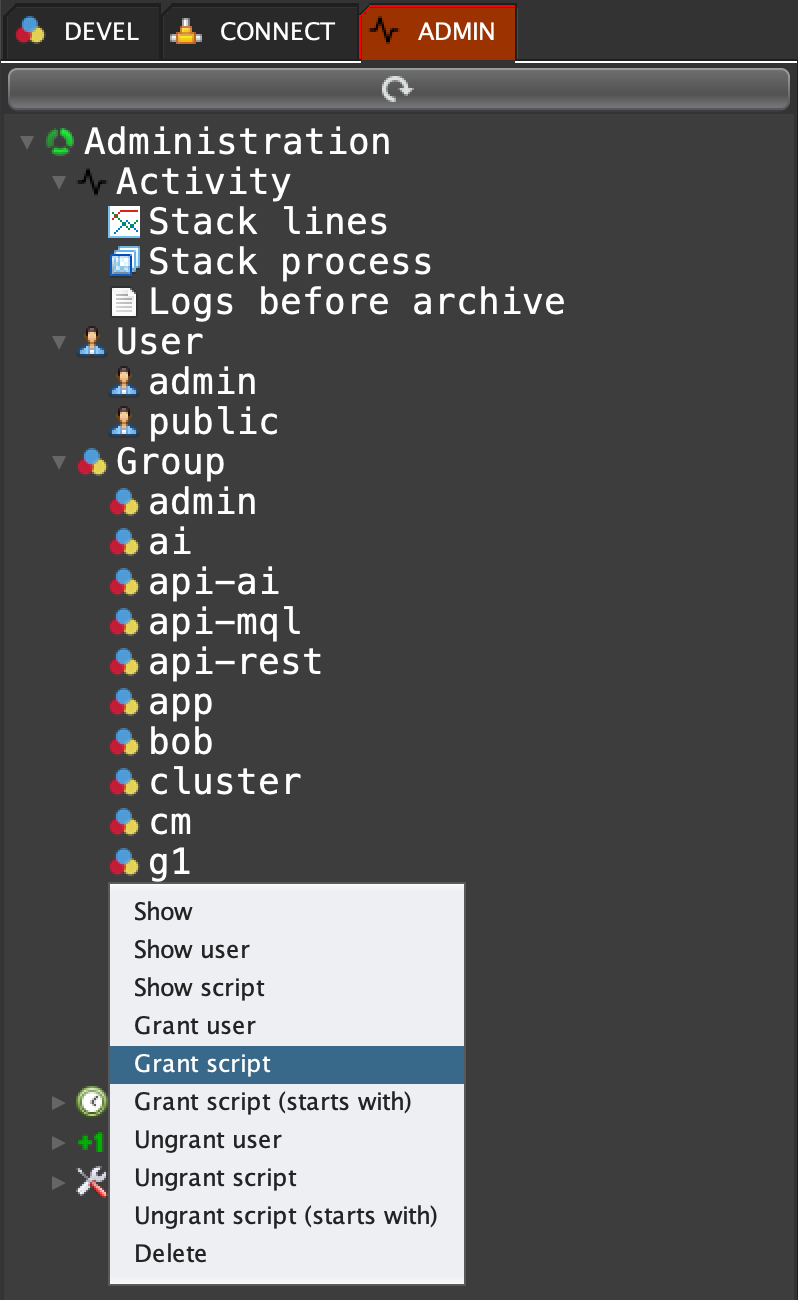 Click on 'ADMIN' tab, open 'Group', right click on the group 'g1' and select 'Grant script'
