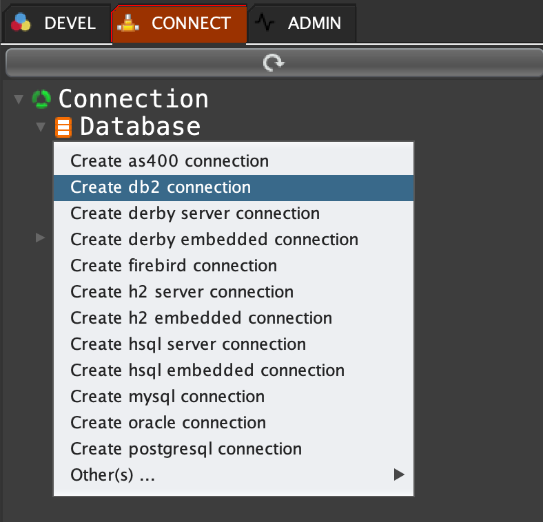 Click on 'CONNECT' tab, right click on 'Database' and select 'Create db2 connection'