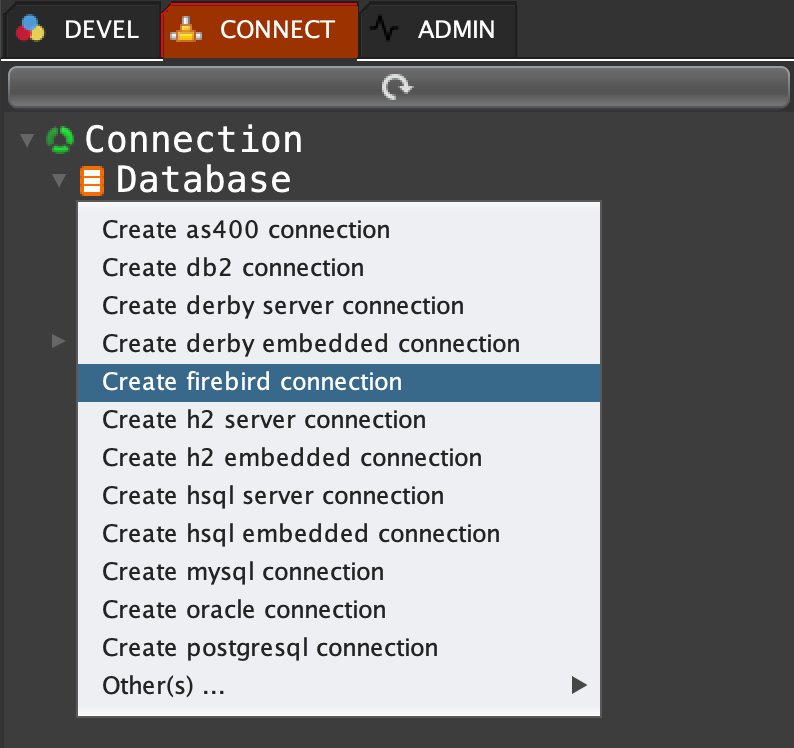 Click on 'CONNECT' tab, right click on 'Database' and select 'Create firebird connection'