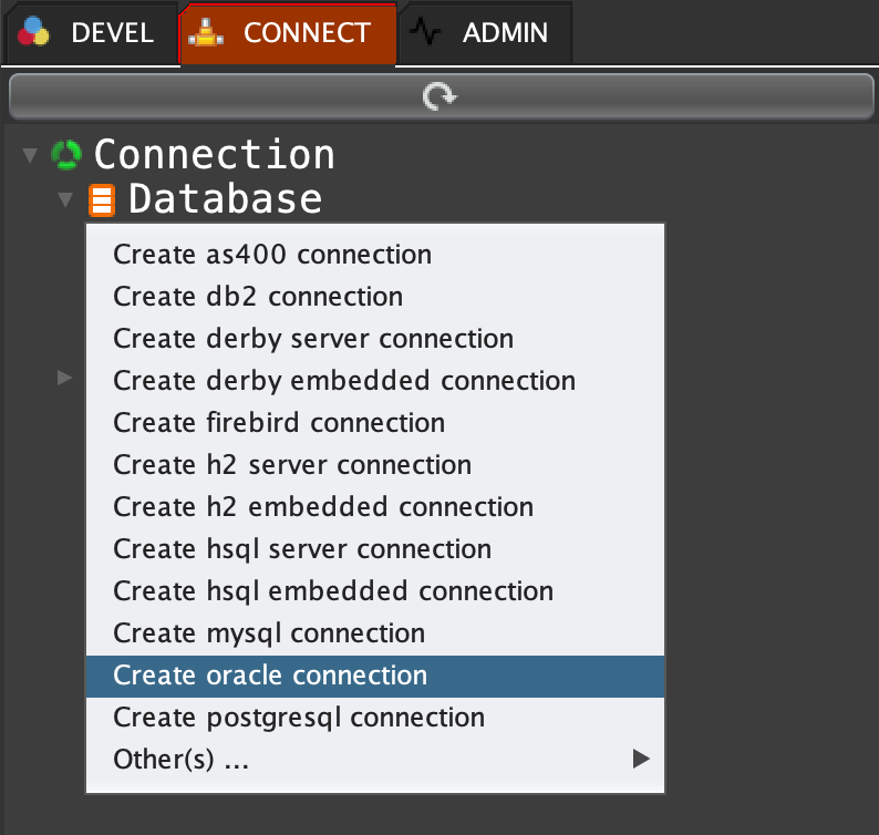Click on 'CONNECT' tab, right click on 'Database' and select 'Create oracle connection'