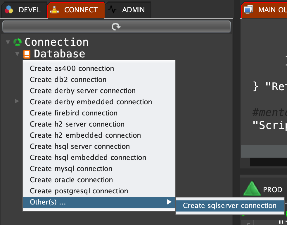 Click on 'CONNECT' tab, right click on 'Database' and select 'Create sqlserver connection'