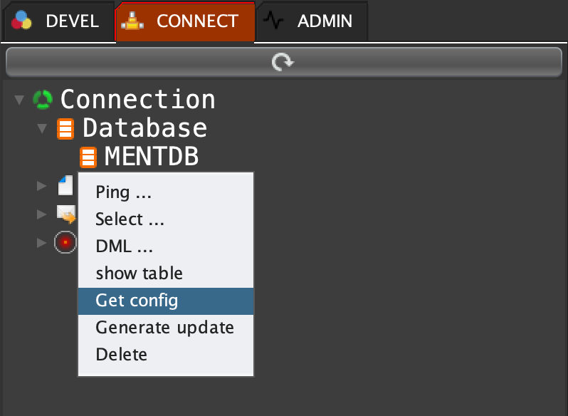 Click on 'CONNECT' tab, open 'Database', right click on 'MENTDB' and select 'Get config'