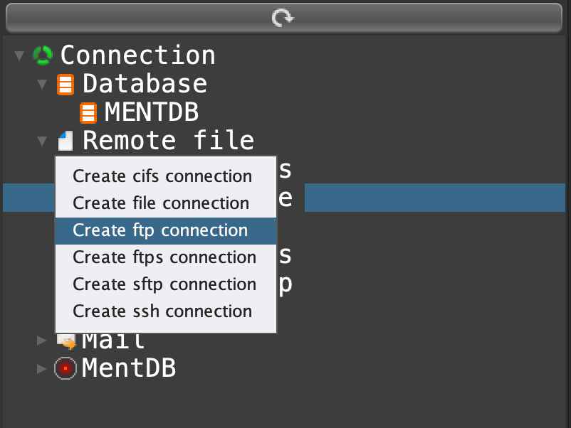 Click on 'CONNECT' tab, right click on 'Remote file' and select 'Create ftp connection'