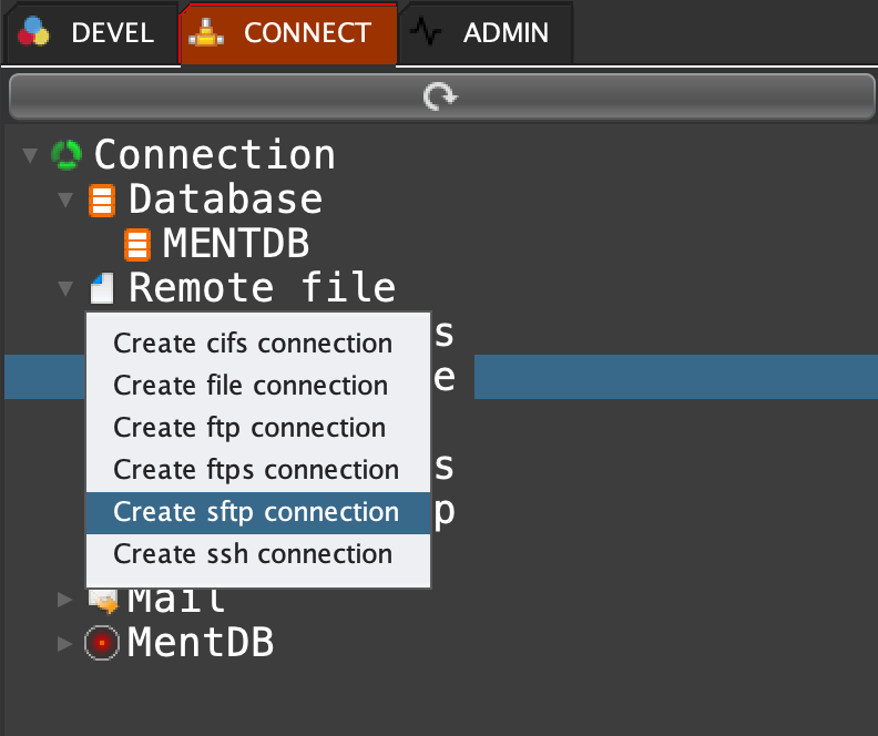 Click on 'CONNECT' tab, right click on 'Remote file' and select 'Create sftp connection'