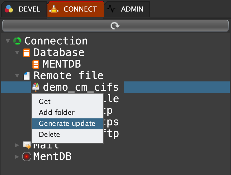 Click on 'CONNECT' tab, open 'Remote file', right click on 'demo_cm_cifs' and select 'Generate update'