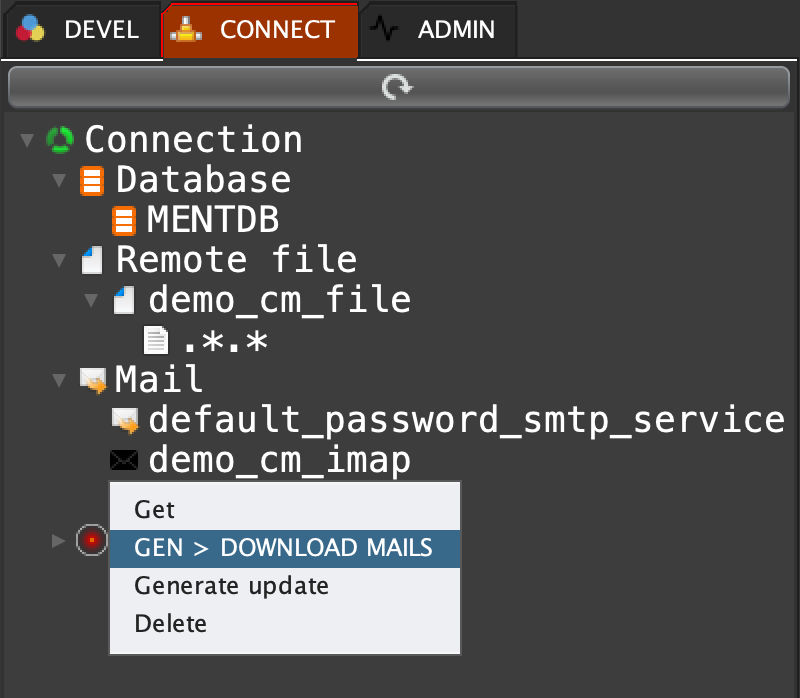 Click on 'CONNECT' tab, open 'Mail', right click on 'demo_cm_imap' and select 'GEN > DOWNLOAD MAILS'