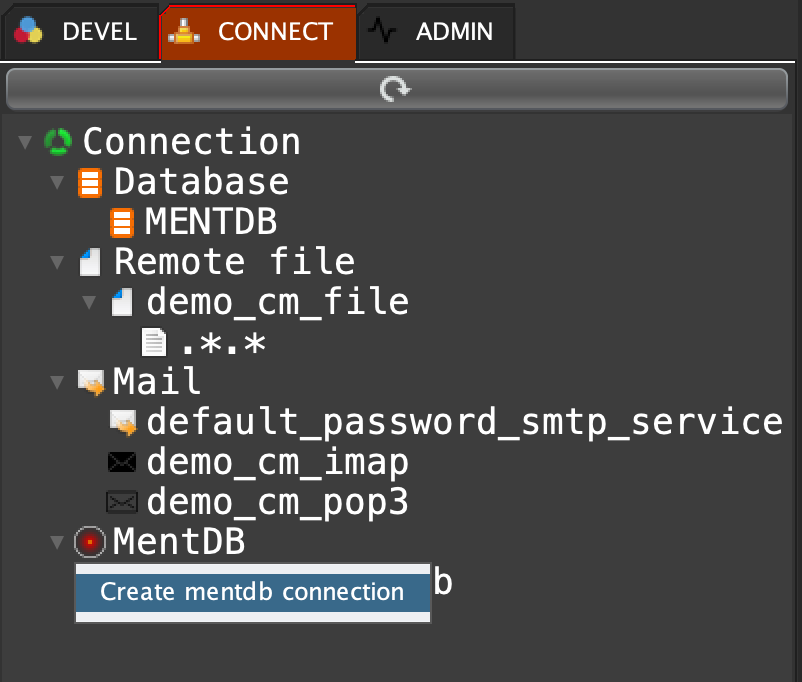 Click on 'CONNECT' tab, right click on 'MentDB' and select 'Create mentdb connection'