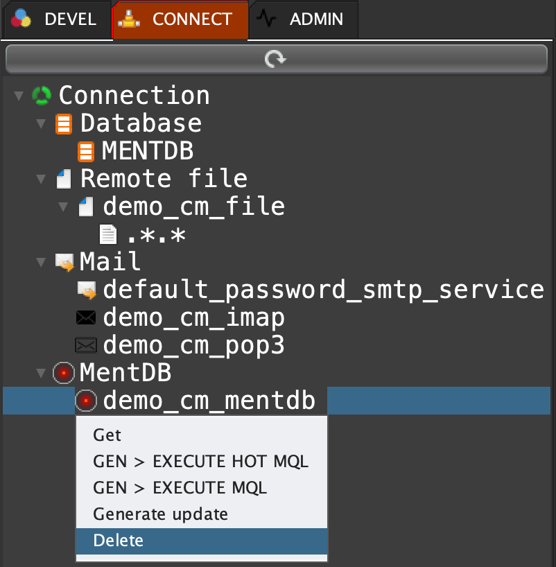 Click on 'CONNECT' tab, open 'MentDB', right click on 'demo_cm_mentdb' and select 'Delete'