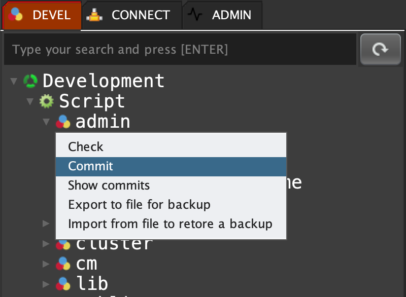 Click on 'DEVEL' tab, open 'Script', right click on 'admin' and select 'Commit'