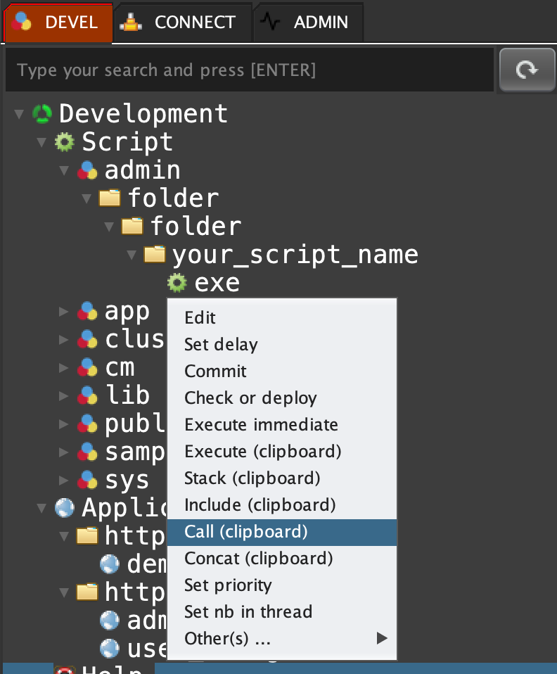 Click on 'DEVEL' tab, open 'Script', open 'admin', right click on 'folder.folder.your_script_name.exe' and select 'Call (clipboard)'