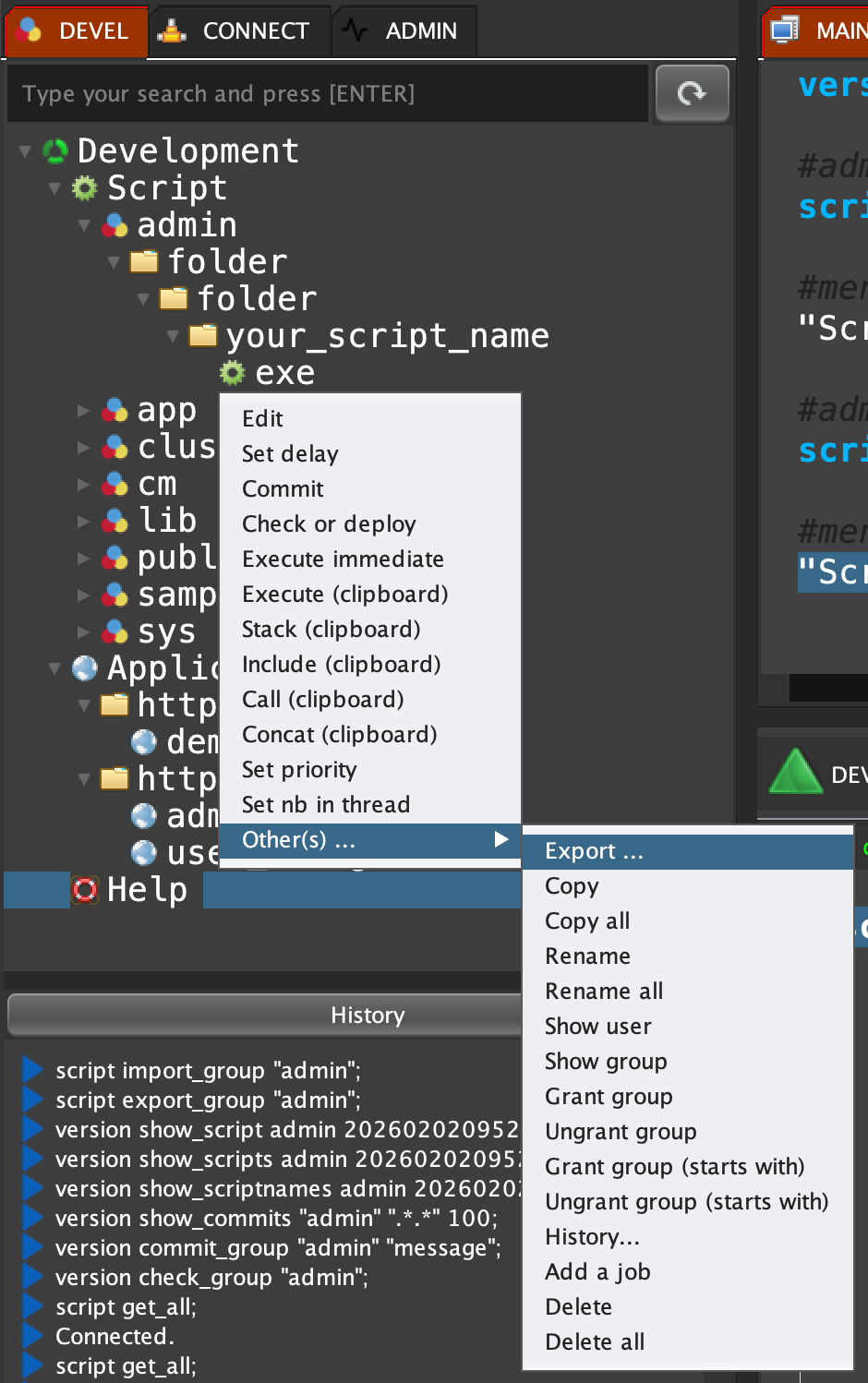 Click on 'DEVEL' tab, open 'Script', open 'admin', right click on 'folder.folder.your_script_name.exe' and select 'Export ...'