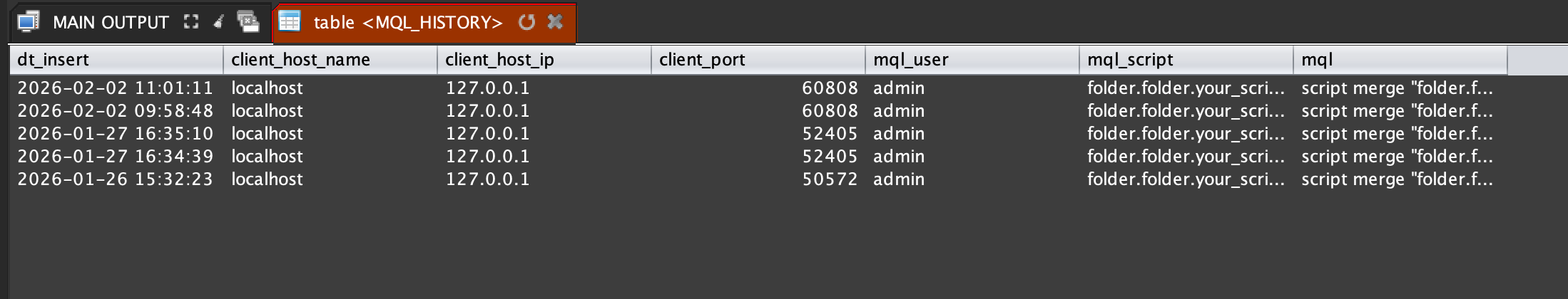 sql select "MENTDB" "select * from history where mql_script like '%folder.folder.your_script_name.exe%' -- and dt_insert between '2026-01-03 00:00:00' and '2026-02-02 23:59:59' -- and mql_user = 'admin' order by dt_insert desc, mql_script limit 0, 100" "MQL_HISTORY";