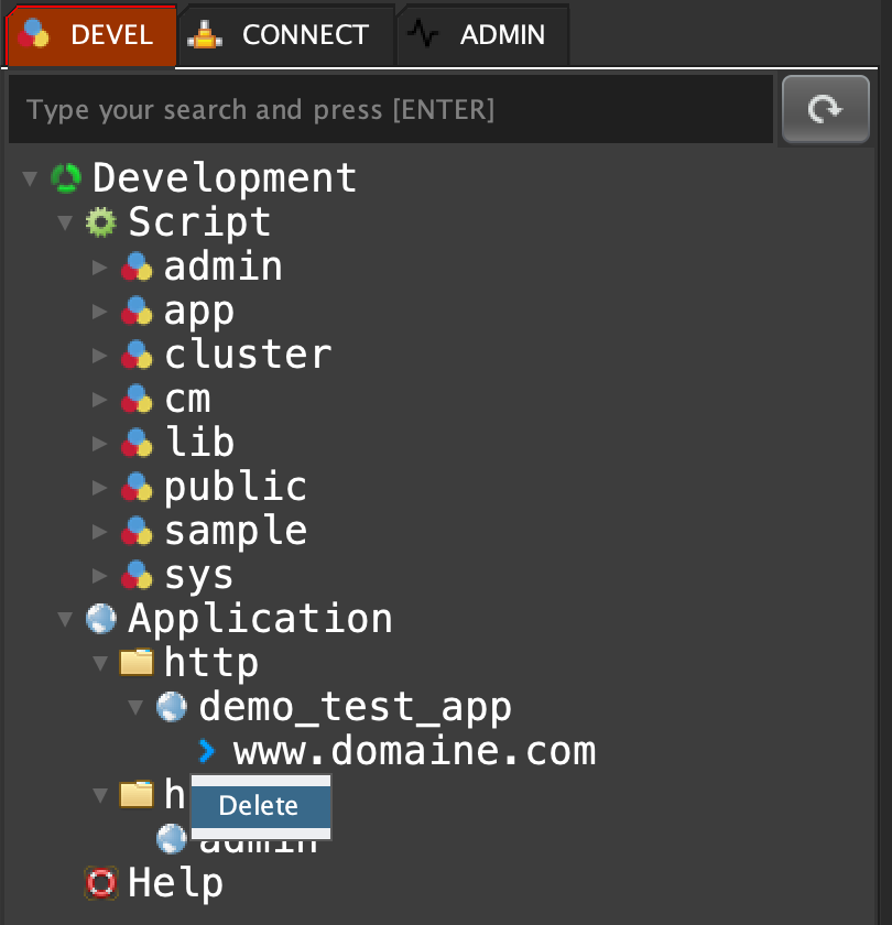 Click on 'DEVEL' tab, open 'Application', open 'http', open 'demo_test_app', right click on 'www.domaine.com' and select 'Delete'