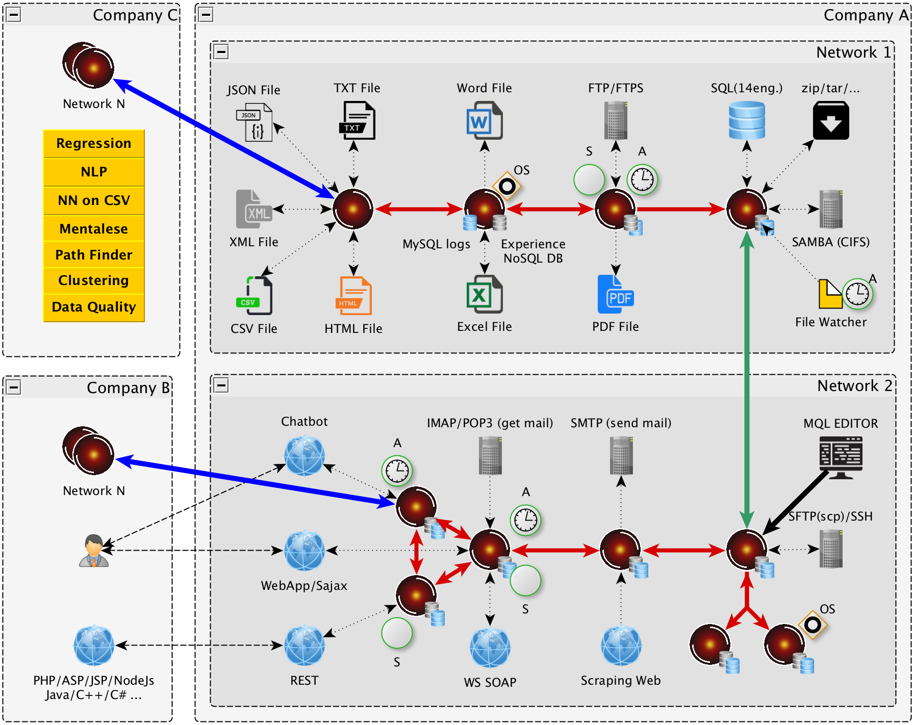 MentDB Weak is a comprehensive development platform: **ETL + ESB + SOA + WebApp + AI (Weak) = all-in-one.** You control your company's data as if it were a single database, you build applications, and you train prediction machines... even when dealing with different networks or software!